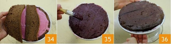 Couvrez la glace avec d'autres tranches de biscuit 34 et badigeonnez-les également avec le sirop au raisin fraise 35. Placez le zuccotto au congélateur jusqu'à ce qu'il soit complètement solidifié (cela prendra environ 2 heures). Lorsqu'il est bien ferme, démoulez-le délicatement : pour faciliter l'opération, vous pouvez plonger rapidement le zuccotto dans un bol d'eau bouillante pendant quelques secondes seulement 36.