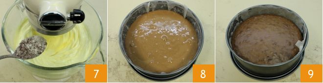 Incorporez ensuite les poudres tamisées dans la crème obtenue 7. Continuez à battre avec les fouets jusqu'à bien amalgamer les ingrédients. Ensuite, prenez un moule de 24-26 cm de diamètre (de préférence amovible), beurrez-le et chemisez-le de papier sulfurisé (vous pouvez consulter la procédure ici : comment chemiser un moule avec du papier sulfurisé). Versez le mélange obtenu à l'intérieur 8 et enfournez dans un four statique préchauffé à 180°C pendant 45 minutes (si four ventilé, cuire à 160°C pendant 35-40 minutes). Lorsque le biscuit est prêt, sortez-le du four 9, laissez-le tiédir légèrement.