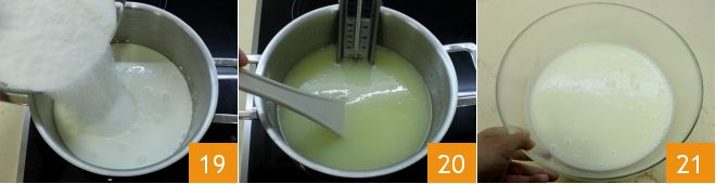 Ajoutez ensuite le sucre 19. Allumez le feu moyen et portez le mélange à une température de 83°C, en vérifiant la température avec un thermomètre alimentaire 20. Une fois la température atteinte, retirez le mélange du feu et refroidissez-le rapidement dans un surgélateur ou transférez-le dans un bol rempli de glace pour le refroidir très rapidement 21.