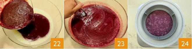 Lorsque le mélange de crème et de sucre et le jus de raisin fraise sont bien froids, mélangez-les (22-23) et transférez-les dans la sorbetière 24. Le bol de la sorbetière doit être bien froid, nous vous conseillons donc de le mettre au congélateur au moins la veille.