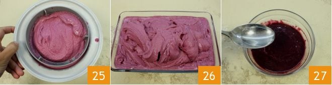 Mettez la sorbetière en marche jusqu'à ce que le mélange ait épaissi (cela prendra environ 30-35 minutes) 25. Versez ensuite la glace obtenue dans un grand bol 26, nivelez-la et laissez-la au congélateur pendant au moins 30 minutes. Pendant ce temps, préparez le sirop pour le biscuit au cacao. Mixez le raisin fraise nécessaire pour le sirop comme vous l'avez fait précédemment (séquences 11-12-13) et versez le jus obtenu dans un petit bol. Allongez ensuite le jus avec 2 cuillères à soupe d'eau 27.