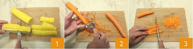 Pour préparer la soupe de maïs, commencez par égrener les épis précuits à la vapeur : placez-les sur une planche à découper et tranchez-les avec un couteau dans le sens de la longueur 1, sinon vous pouvez aussi les égrener avec les mains. Continuez en nettoyant et coupant les légumes qui constitueront la base : épluchez les carottes avec un éplucheur 2, puis réduisez-les en bâtonnets fins et enfin en dés 3.
