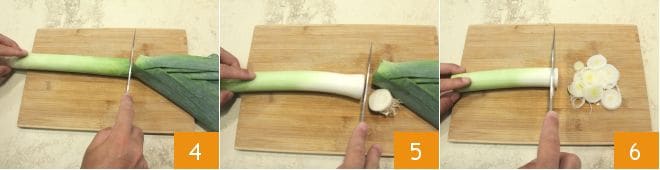 Ensuite, placez le poireau sur une planche à découper et éliminez les deux extrémités (4-5), puis coupez-le en rondelles 6.
