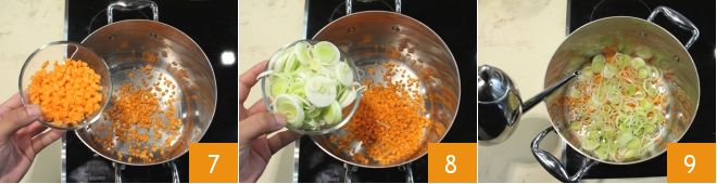 Transférez les carottes en dés 7 et le poireau en rondelles 8 dans une grande casserole à bords hauts, arrosez-les d'un filet d'huile d'olive extra vierge et faites revenir à feu moyen pendant quelques minutes 9.