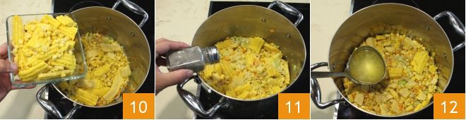 Quand les légumes de la base seront bien dorés, ajoutez les grains de maïs 10 et laissez mijoter pendant 5-6 minutes à feu doux. Ensuite, salez et poivrez à votre goût 11, ajoutez le bouillon de légumes jusqu'à couvrir le mélange 12 et laissez cuire pendant environ 35 minutes. Pour découvrir comment préparer au mieux le bouillon de légumes, consultez l'école de cuisine : bouillon de légumes.
