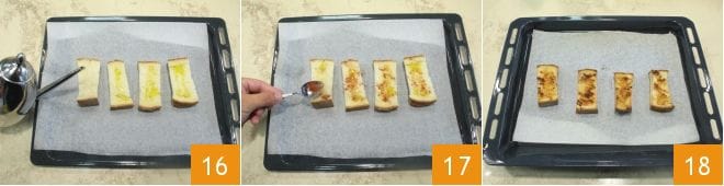 En attendant, préparez les croûtons pour accompagner la soupe de maïs : coupez 4 tranches de pain de blé dur et disposez-les sur une plaque recouverte de papier sulfurisé, puis versez un filet d'huile d'olive extra vierge sur chaque tranche 16. Ensuite, salez à votre goût et saupoudrez chaque tranche de paprika piquant en poudre 17. Une fois les tranches de pain assaisonnées, enfournez dans un four statique préchauffé à 250° pendant 5 minutes en mode grill, jusqu'à ce qu'elles soient légèrement grillées et croustillantes 18. Si vous utilisez un four ventilé, faites cuire à 240° pendant 2 minutes et demie en mode grill.