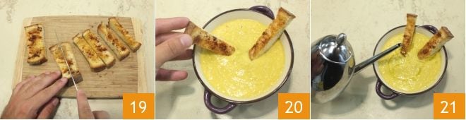Une fois ce temps écoulé, sortez le tout du four et laissez refroidir les tranches de pain sur une grille, puis disposez-les sur une planche à découper et divisez-les en deux dans le sens de la longueur, formant des bâtonnets 19 ou formez des cubes. Dressez la soupe de maïs et accompagnez-la avec les croûtons 20. Saupoudrez le tout d'une pincée de poivre et terminez en versant un filet d'huile 21 : il ne vous reste plus qu'à servir et déguster la soupe de maïs avec les croûtons bien chaude !
