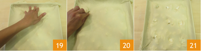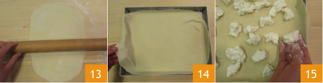 Vous devez obtenir une pâte rectangulaire 13, d'une taille supérieure à une plaque de 30x40 cm. L'épaisseur de la pâte doit être uniforme et d'environ 1 mm. Vous pouvez soulever la pâte et voir à la lumière les points les plus épais à étirer encore avec le rouleau. Si la pâte a tendance à se rétracter pendant que vous l'étalez, attendez quelques minutes avant de continuer. En attendant, badigeonnez une des deux plaques avec 10 g d'huile d'olive extra vierge. Ensuite, posez la pâte en veillant à ce que les bords dépassent et en la faisant bien adhérer à la plaque 14. Répartissez environ 400 g de crescenza, en petits morceaux, en alternant une rangée de trois et une de deux. Laissez quelques centimètres entre chaque tas 15. À l'aide d'un pinceau imbibé d'huile, ajoutez quelques gouttes d'huile.