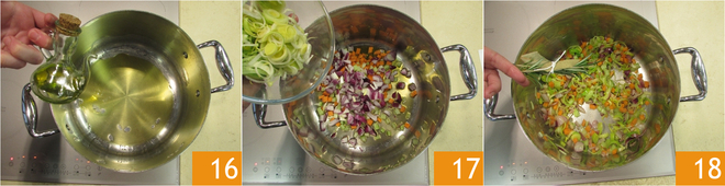 Maintenant, tous les ingrédients pour préparer le minestrone de légumes sont prêts. Dans une grande casserole munie d'un couvercle, versez l'huile 16, les carottes, le céleri, l'oignon et le poireau 17 et faites-les revenir doucement pendant une dizaine de minutes, en remuant souvent. Une fois que les légumes du soffritto seront tendres, ajoutez le bouquet garni 18.