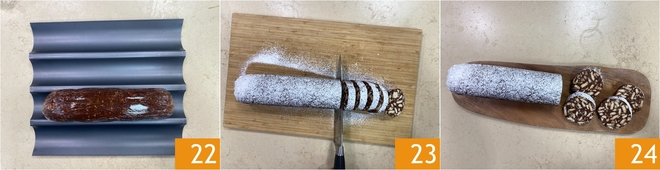 Transférez le salami au chocolat au réfrigérateur pendant au moins 3 heures, pour obtenir une forme plus ronde, nous l'avons placé sur un moule à baguettes 22. Après 3 heures, retirez le film plastique, saupoudrez de sucre glace et coupez-le en tranches 23. Le salami au chocolat est prêt à être servi 24 !
