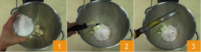 Per preparare la crostata come prima cosa realizzate la pasta frolla. Nella ciotola di una planetaria dotata di foglia versate il burro morbido ma ancora plastico. Aggiungete lo zucchero a velo 1, i semini che avrete prelevato dal baccello di vaniglia 2 e la scorza grattugiata del limone 3.