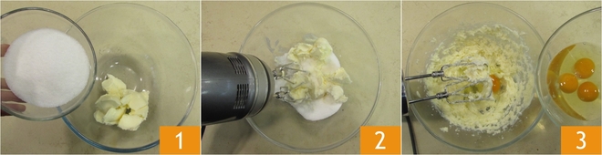 Pour préparer le gâteau au chocolat, commencez par faire fondre le chocolat noir au bain-marie ou au micro-ondes et laissez-le tiédir. Pendant ce temps, mettez dans un bol le beurre ramolli et le sucre 1. Ajoutez une pincée de sel et travaillez avec un batteur électrique jusqu'à obtenir un mélange doux et crémeux 2. Versez 2 des 4 œufs 3 et continuez à travailler jusqu'à absorption complète.
