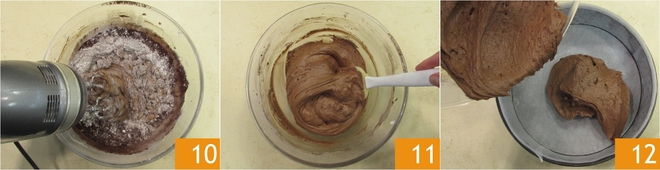Incorporez les poudres avec le batteur électrique 10 : vous devez obtenir une pâte lisse et homogène 11. Versez la pâte dans un moule de 22 cm de diamètre tapissé de papier cuisson (alternativement, vous pouvez le beurrer et le fariner) 12.
