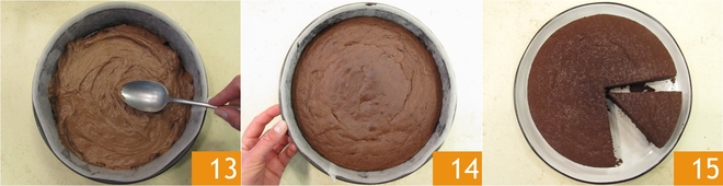 Nivelez la surface avec le dos d'une cuillère 13 et faites cuire dans un four statique préchauffé à 180° pendant environ 40 minutes. Après ce temps, vérifiez la cuisson avec un cure-dent, puis sortez-le du four et laissez refroidir avant de démouler le gâteau 14. Saupoudrez de peu de cacao amer et servez votre gâteau au chocolat 15 !