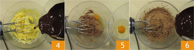 Ajoutez également la moitié du chocolat fondu 4 et mélangez la préparation avec le batteur. Continuez en ajoutant les œufs restants 5 et le reste du chocolat fondu 6, en mélangeant à chaque fois avec le batteur jusqu'à absorption complète.