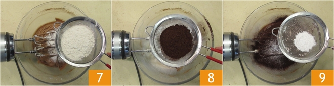 À ce stade, tamisez dans le bol la farine 7, le cacao 8 et la levure 9.