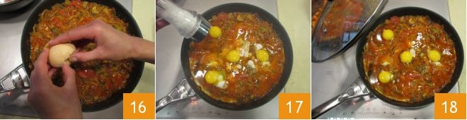 Lorsque l'huile est remontée à la surface, ajoutez des feuilles de basilic et ajoutez les œufs en les cassant directement dans la poêle 16. Disposez-les en les espaçant entre eux. Ajustez le sel 17 et couvrez avec un couvercle 18.