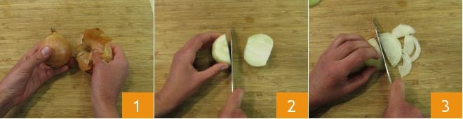 Pour préparer l'acquacotta, commencez par préparer le bouillon de légumes et gardez-le au chaud. Commencez par éplucher les oignons 1, puis coupez-les en deux 2 et tranchez-les finement 3.