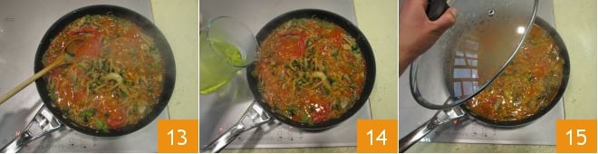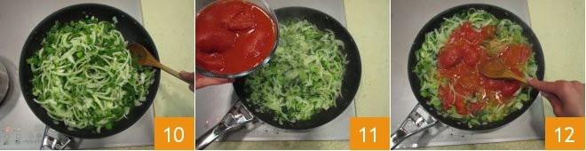 Mélangez avec une cuillère en bois 10 et laissez cuire jusqu'à ce que l'eau soit complètement évaporée. Ensuite, vous pouvez ajouter les tomates pelées 11 et, en utilisant la cuillère, les écraser délicatement pour les rompre 12.