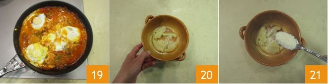 Laissez les œufs prendre, cela prendra environ 4-5 minutes 19. Pendant ce temps, cassez une fine tranche de pain toscan rassis, dans chaque cocotte. Vous pourrez le casser avec les mains et le disposer de manière à couvrir le fond 20. Ajoutez dessus le pecorino râpé 21
