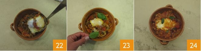 et avec une louche, ajoutez également la soupe, en veillant à prendre aussi un œuf pour chaque cocotte 22. Garnissez avec un filet d'huile à cru, une feuille de basilic 23 et servez votre soupe 24.