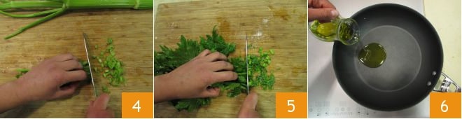 Transférez-les dans un bol et passez au céleri. Commencez par bien le laver, puis coupez en tranches assez fines à la fois les côtes 4 et les feuilles 5. Versez l'huile dans une casserole 6,