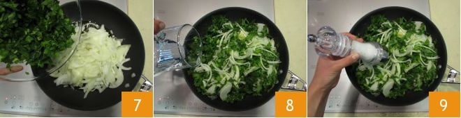 allumez le feu et ajoutez les oignons et le céleri 7. Ajoutez l'eau 8 et ajoutez le sel 9.