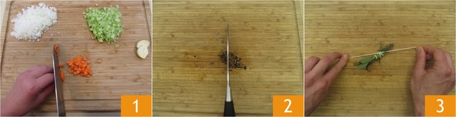 Pour réaliser l'agneau en ragoût, commencez par nettoyer et couper en dés d'environ 1 cm le céleri, la carotte et l'oignon 1. Hachez les épices au couteau 2 et attachez les herbes aromatiques (sauge, thym, laurier et romarin) avec une ficelle 3.