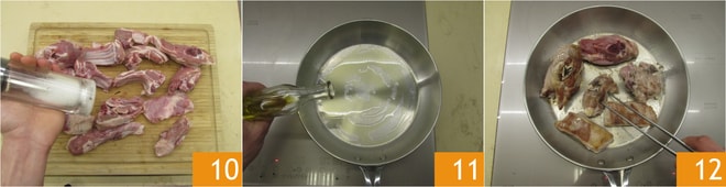 Salez l'agneau 10, versez un filet d'huile dans une poêle 11, disposez l'agneau et faites-le bien dorer de tous côtés à feu vif 12.