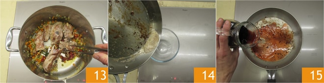 Lorsqu'il a une belle couleur dorée, transférez les morceaux d'agneau dans la casserole avec les légumes 13. Retirez la graisse de la poêle dans laquelle vous avez fait revenir la viande 14 et versez dans la même poêle le vin rouge 15 en veillant à bien décoller le fond de cuisson de la poêle.