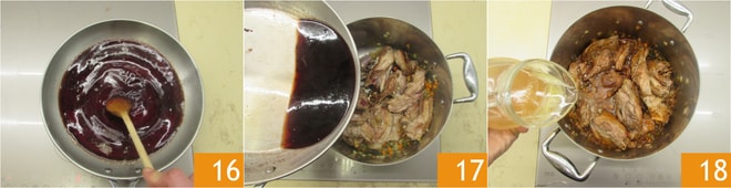 Lorsque l'alcool est bien évaporé et réduit d'un tiers 16, versez dans la casserole avec la viande 17. Remettez sur le feu et ajoutez le bouillon de viande 18.