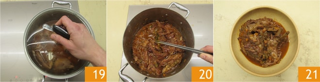 Continuez la cuisson à feu très doux, avec couvercle 19 pendant une heure et ensuite une bonne demi-heure sans couvercle, de sorte que le liquide s'évapore et que la sauce prenne consistance 20. À ce stade, l'agneau en ragoût est prêt, servez-le chaud 21.