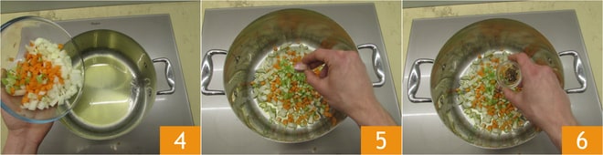 Dans une grande casserole à bords hauts, faites chauffer un filet d'huile et faites revenir les légumes 4 en ajoutant une gousse d'ail écrasée avec sa peau 5. Ajoutez les épices hachées au soffritto 6.