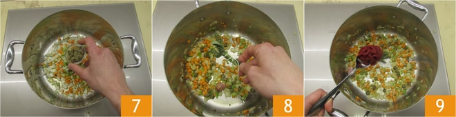 Après quelques minutes, ajoutez les câpres dessalés 7 et continuez à feu doux pendant quelques minutes. Ajoutez également le bouquet garni 8. Versez enfin le concentré de tomate 9, remuez quelques minutes et mettez de côté, ce sera la base de la cuisson en ragoût.