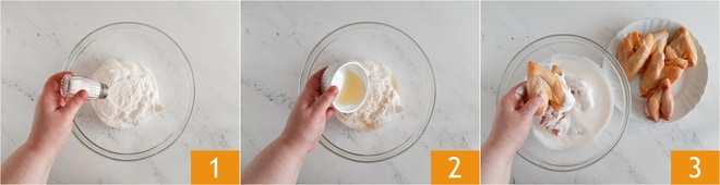 Pour préparer les ailes de poulet au four, versez le yaourt dans un grand bol, assaisonnez avec du sel 1 et du poivre, le jus de citron 2 et mélangez. Plongez les ailes de poulet 3.