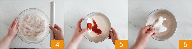 Couvrez avec du film plastique 4 et laissez mariner pendant 3 heures au réfrigérateur. Une fois le temps de marinade écoulé, égouttez grossièrement les ailes pour ne pas éliminer complètement le yaourt. Dans un bol, versez la farine et le paprika 5, panez les ailes 6.