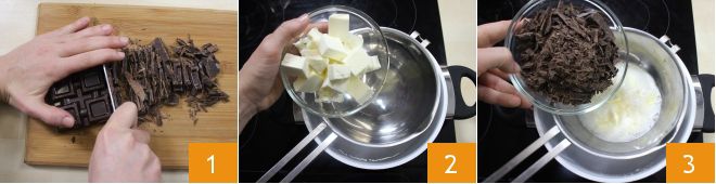 Pour réaliser les sapins de Noël brownies, commencez par préparer le gâteau : aidez-vous d'un couteau pour réduire en morceaux assez petits le chocolat noir 1. Faites fondre le beurre au bain-marie 2, à feu doux, puis ajoutez le chocolat 3 :