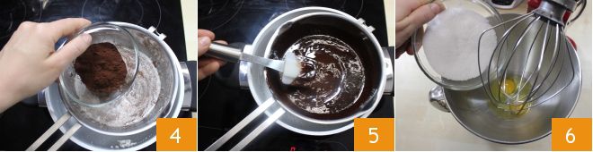 lorsqu'il commencera à fondre, ajoutez le cacao amer en poudre 4. En continuant de mélanger, laissez le tout fondre jusqu'à former une crème épaisse et sans grumeaux 5. Quand les ingrédients sont complètement amalgamés, éteignez le feu et laissez tiédir. À part, montez les œufs avec le sucre, en utilisant un batteur sur socle ou un batteur électrique 6,