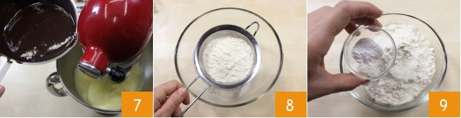puis ajoutez en filet le mélange de chocolat désormais tiède 7. Dans un bol, tamisez la farine 8, ajoutez la levure 9, une pincée de sel et mélangez bien pour amalgamer tous les ingrédients.