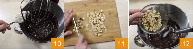 Ajoutez la farine avec la levure au mélange de chocolat 10, une cuillère à la fois, en mélangeant bien et en veillant à ne pas former de grumeaux. Sur une planche, cassez grossièrement les noisettes 11, en vous aidant d'un couteau, puis ajoutez-les également à la pâte 12.