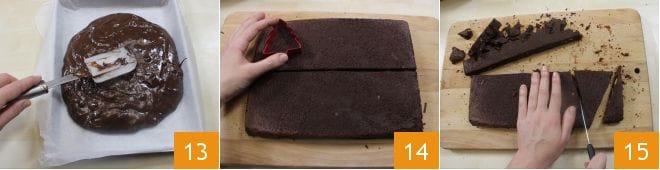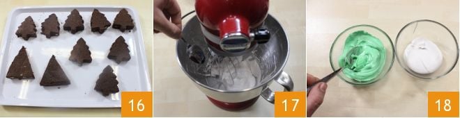 Versez maintenant le mélange dans un moule rectangulaire de 20cm x 28cm, recouvert de papier sulfurisé 13, et enfournez le tout dans un four chaud, statique, à 180° pour 20 minutes. Quand le gâteau sera prêt, laissez-le reposer une dizaine de minutes avant de le retirer du moule. Passé ce temps, coupez le brownie en deux, désormais froid, horizontalement et découpez parmi les deux rectangles obtenus 10 petits sapins, en utilisant un emporte-pièce pour biscuits 14. Si vous n'avez pas l'emporte-pièce, vous pouvez couper le gâteau en triangles égaux 15 (la base de 7-8 cm et les côtés de 9 cm).