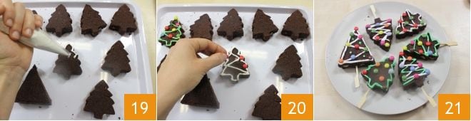 Décorez maintenant les petits sapins en dessinant sur la surface de chacun des lignes en zigzag, ou en en délimitant le contour 19. Placez enfin les bonbons colorés sur le glaçage encore frais 20, pour qu'ils y restent collés. Enfin, prenez des bâtonnets de bois et insérez-les à la base de chaque sapin 21 ; si vous le souhaitez, complétez avec une pincée de sucre glace.