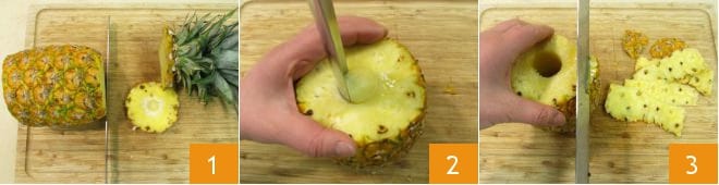 Pour préparer l'ananas grillé au miel et à la cannelle, commencez par Comment nettoyer et couper l'ananas : coupez la couronne supérieure 1, puis utilisez un dénoyauteur pour extraire le cœur central 2 et retirez la peau avec un couteau 3.