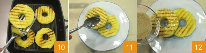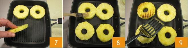 Chauffez une poêle à griller et lorsqu'elle est bien chaude, déposez les tranches d'ananas avec le côté beurré vers le bas 7. Laissez dorer pendant quelques minutes et pendant ce temps, badigeonnez également la partie supérieure avec du beurre fondu 8. Lorsque les tranches d'ananas sont bien grillées, retournez-les de l'autre côté 9