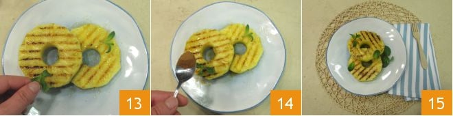 Parfumez avec les feuilles de menthe 13 et la cannelle en poudre 14. Servez immédiatement vos tranches d'ananas grillées au miel et à la cannelle 15