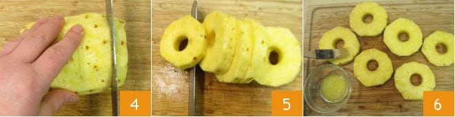 Tranchez l'ananas 4 de manière à obtenir environ 6 tranches épaisses de 2 cm 5. Badigeonnez un côté des tranches d'ananas avec du beurre fondu 6.