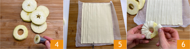 Percez les tranches en utilisant le côté le plus large 4. Réservez les tranches de pomme et découpez dans la pâte feuilletée des bandes d'environ 1,5 cm de largeur 5. Enroulez les bandes de pâte autour des anneaux de pomme 6 de manière à les recouvrir entièrement.