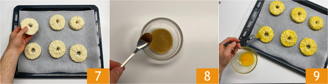 Déposez les anneaux sur une plaque recouverte de papier cuisson 7. À part, mélangez dans un bol le sucre et la cannelle 8 et dans un autre mélangez le jaune d'œuf avec la crème et badigeonnez la surface avec ce mélange 9.