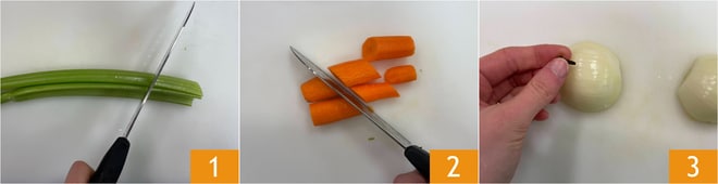 Pour préparer les anolini, commencez par couper le céleri 1 et les carottes 2 en morceaux. Coupez les oignons en deux et piquez-les avec les clous de girofle 3.