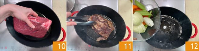 Ajoutez le bœuf 10 et faites dorer tous les côtés 11. Retirez la viande, ajoutez un peu d'huile, les légumes coupés en morceaux 12 et faites-les revenir quelques minutes.